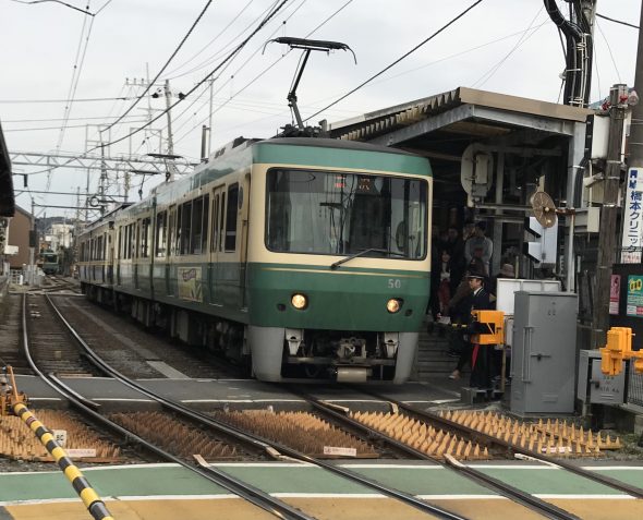 画像は途中ですれ違った江ノ電、場所は長谷駅ですね。