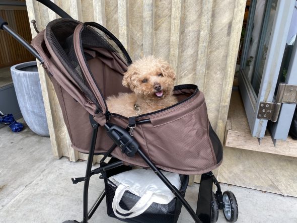5月に16歳になり、長い時間や距離を歩くことがなかなか厳しくなってきたのでついにあずき用のバギーを購入しました(^^;