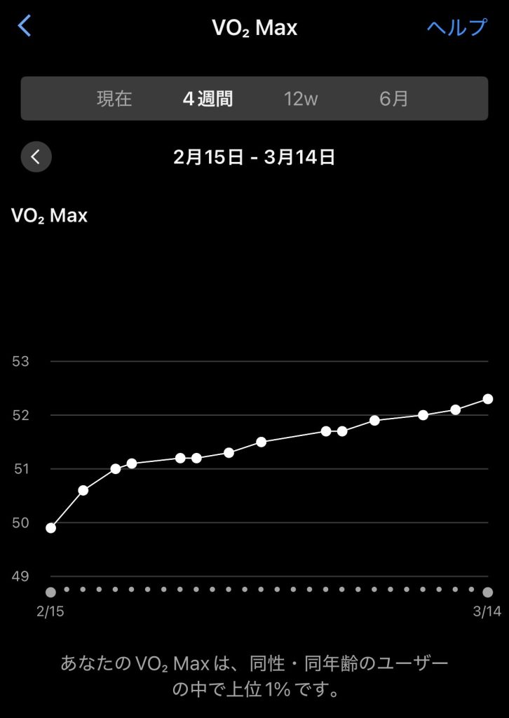私は、日頃ガーミンのランニングウオッチをしているのでこの数値を測ることが出来るのですが、最近数値が向上してきました、今日のランニングの後では52強になっています。