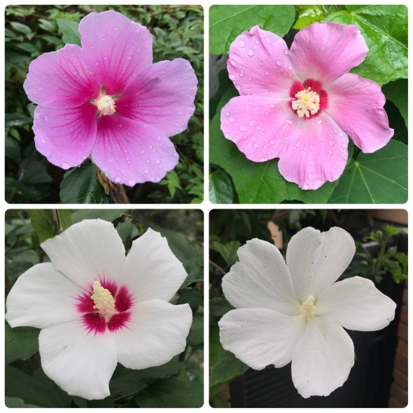 上の4つの写真のうち右上が芙蓉でそれ以外はムクゲになります。