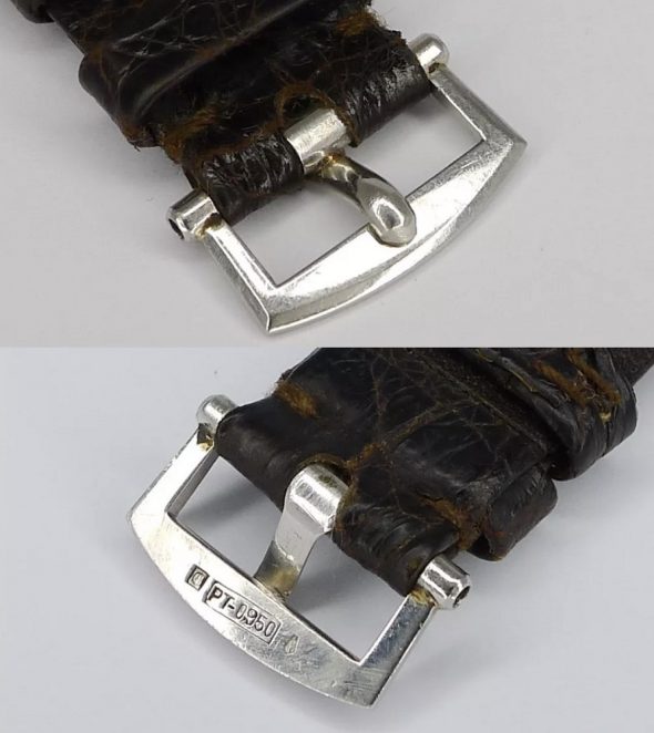 この形状のバックルは30年代の時計に付属するのですが、イエローは極めてまれに見ることはありますが、それ以外の素材を見るのはまずありません。