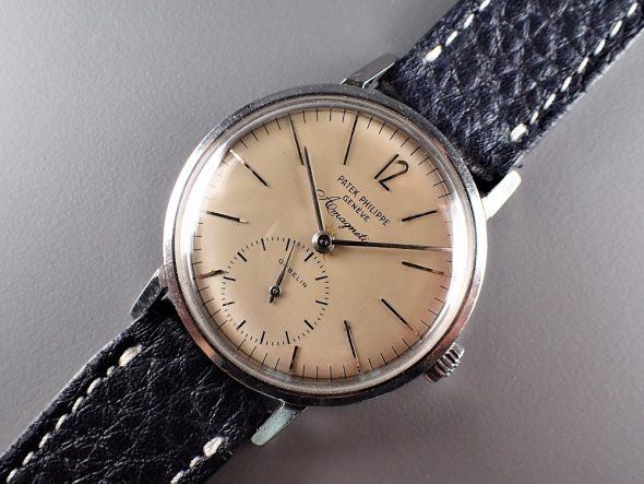 製造個数は明確な資料はありませんが、12-400を搭載したモデルを第一世代として100~150個程度、1960年以降の27AM-400を搭載したモデルを第二世代として300~500個程度ではないでしょうか。従ってref.3417のトータルの製造数は500~700個程度を推測しております。Ref.3417が市場でとても人気が高いのはその耐磁性のあるムーブメントの存在よりもビンテージパテックの中でも最も個性的なダイヤルが理由であることは言うまでもありません。