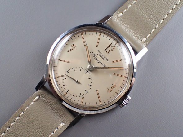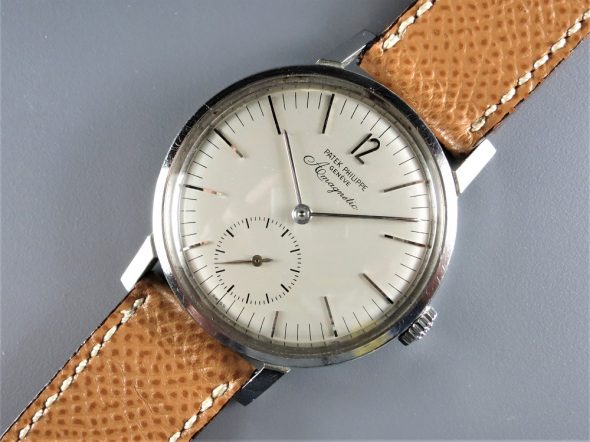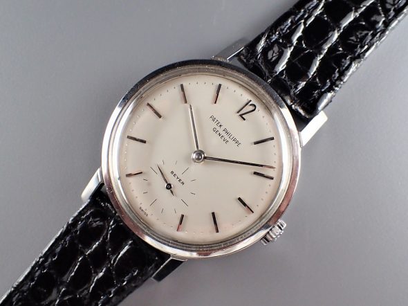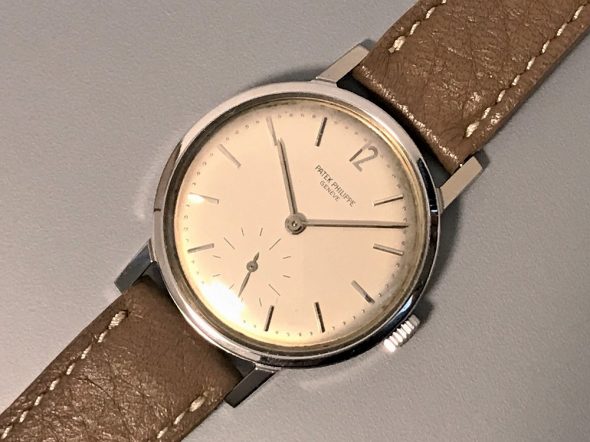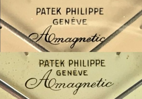 ref.3417は他の同時期のビンテージパテックと比べると、ダイヤルのコンディションが良くない物が多いように思われます。これは推測ですが、ref.3417はパテックの中でも耐磁性のあるスティール時計として、どちらかというと実用的な時計としての位置づけだったのではないでしょうか。従って、販売後も実際にオーナーに高頻度で使用された時計が多く、そのため結果的にダイヤルにダメージが生じた可能性があります。しかし、中には本当にミントコンディションのダイヤルも特にプリントの物で存在しております。ここに一つ問題があります。それは、パテック本社がプリントのストックダイヤルを近年まで(もしかしたら現在も)在庫で保有していたという事実です。これももしかしたら前述の通り、ref.3417はダイヤルにダメージのある物が多かった為に、オーバーホール時に交換する目的で大量に在庫するようにしていたのかもしれません。しかもそのダイヤルは後年のプリントのダイヤルと比較してもなんの違いも見当たらず、そのため特に後年の個体でダイヤルが交換されていても全くその痕跡を見分けることが出来ません。ある意味、見極めが出来ないなら、それはそれで良いじゃないかという考え方もあるかもしれません。もちろん、初期のタイプ(1960年以前のタイプ)にミントのプリント文字盤が入っていたら、これはちょっと躊躇した方が賢明かもしれません(でも初期物にプリントダイヤルが入ることは絶対無いとは言い切れません)。