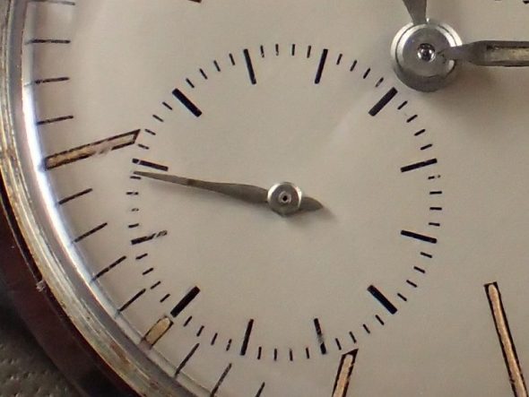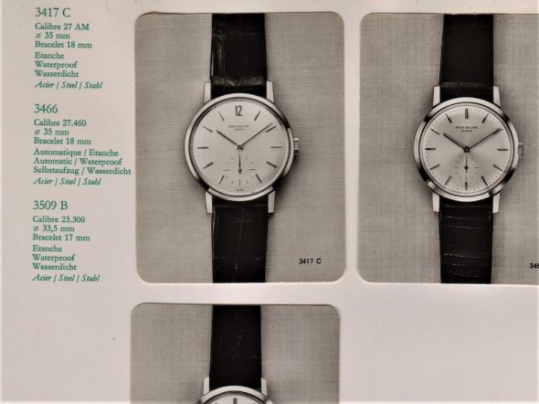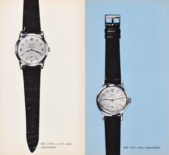 中にはバトンの物も見られますが(上記2(2)-1もそうですが)、これは恐らく他社製の物か他のリファレンスの物に交換されていると思われます。ただ、ref.3417(とref.2570)が販売が開始された当初のカタログを見ると秒針が明らかにバトンのように見えます。