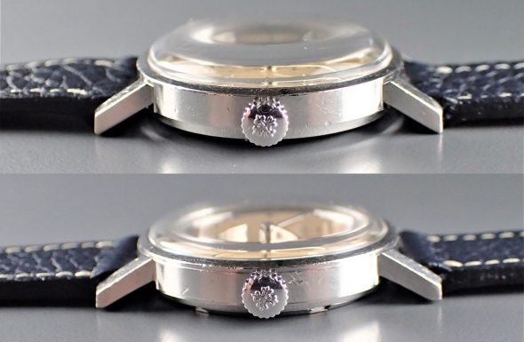 また、初期物と後期物の違いはケースにも見られます。それはケースサイドを見ると分かるのですが、初期の概ね1960年までは、ケースサイドは何も意匠はありませんが、後期の物には細いラインが入ります。